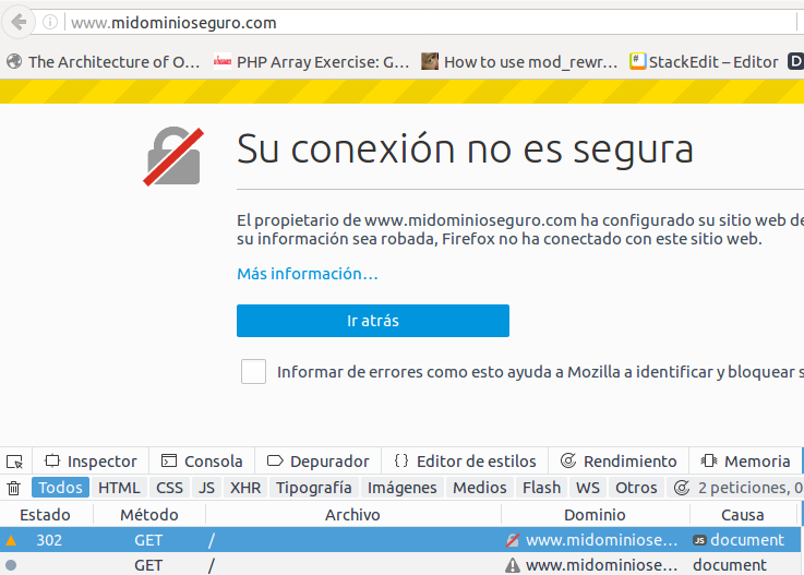 Esto es lo esperado ya que hemos generado un certificado auto-firmado. Evidentemente, nosotros mismos no nos podemos validar porque no tenemos interacción con ninguna de estas autoridades, pero sí que encriptará todas las comunicaciones entre el navegador y el cliente.