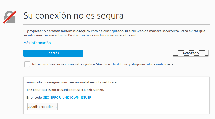 Obtendremos un aviso de que el navegador no puede verificar la identidad de nuestro servidor porque no ha sido firmado por ninguna de las autoridades de certificación en las que él confía